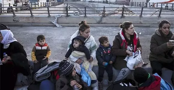 2月19日,难民等着乘坐公交车去希腊与马其顿边境