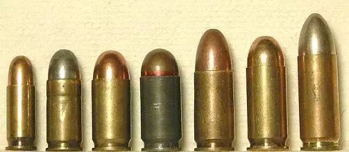最左边这一颗小子弹就是“大乌鸦”手枪的6.35毫米自卫手枪弹(作为对比,左二起依次是.32ACP手枪弹,.380手枪弹,9毫米马卡洛夫手枪弹,9毫米派弹,9x21mm手枪弹等)