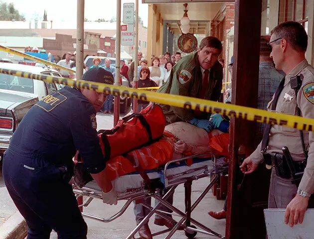9点30分,当罪犯由警方人员护卫着离开机场,在经过付费电话亭的时候,Gary突然转身,掏出手枪,对着罪犯Jeff Doucet的头部开了一枪。